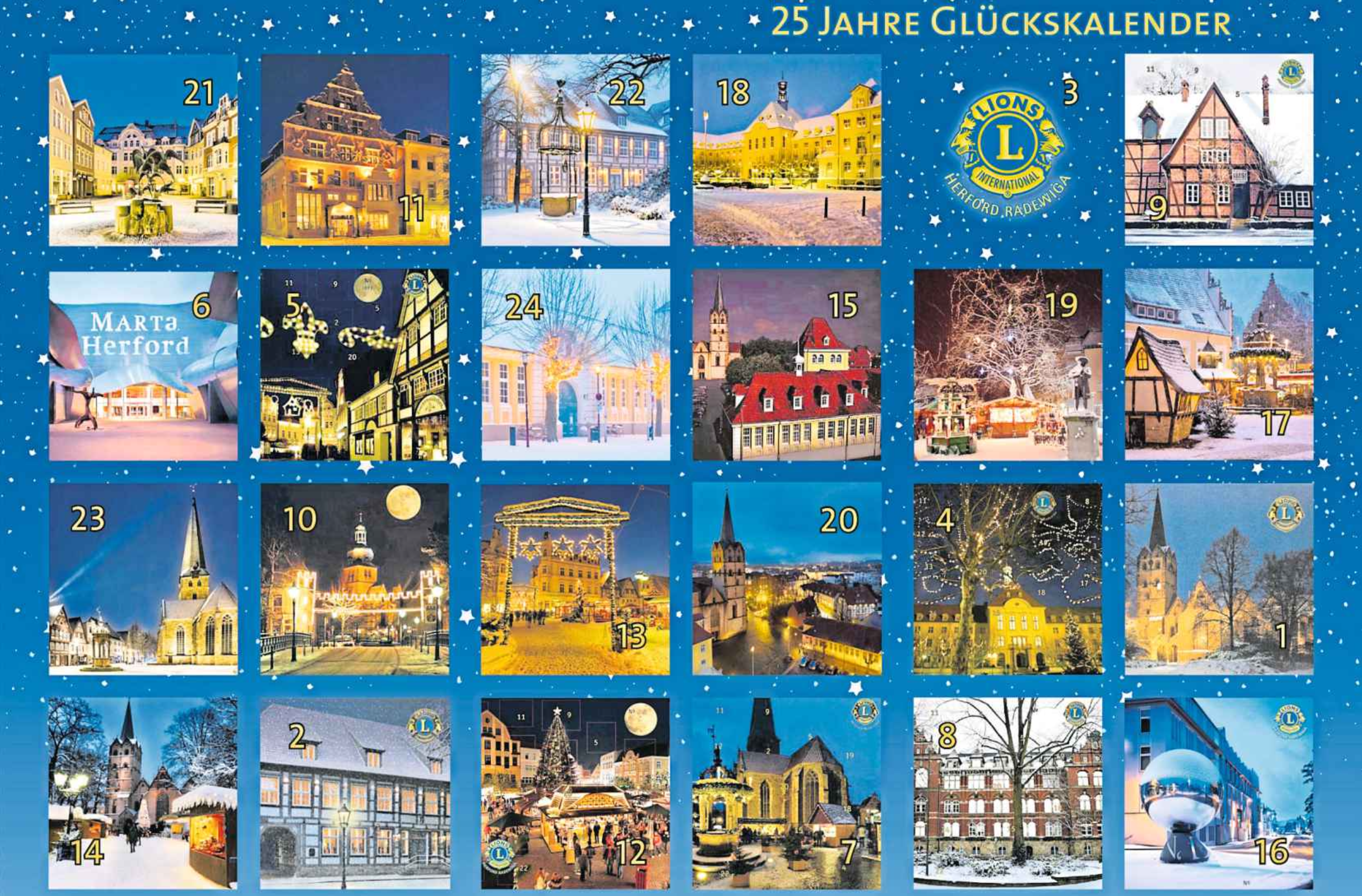 Seit 2001 bieten wir unseren nun schon traditionellen Glückskalender im Advent an. Dafür wird in jedem Jahr ein anderes bekanntes Herforder Stadt-Motiv verwendet. Hinter den 24 Türchen des Kalenders stecken täglich mehrere wertvolle Gewinne. Jeder Kalender hat eine individuelle Losnummer. Die Gewinne werden von zahlreichen Sponsorinnen und Sponsoren aus Herford und Umgebung gestiftet. Es sind unter anderem Reisen, Gutscheine, Eintrittskarten und Sachgeschenke zu gewinnen. Die Herforder Bürgerinnen und Bürger unterstützen dieses Projekt mit dem Kauf der Kalender. Ein Kalender kostet sieben Euro, die Auflage beträgt 3.700 Stück.