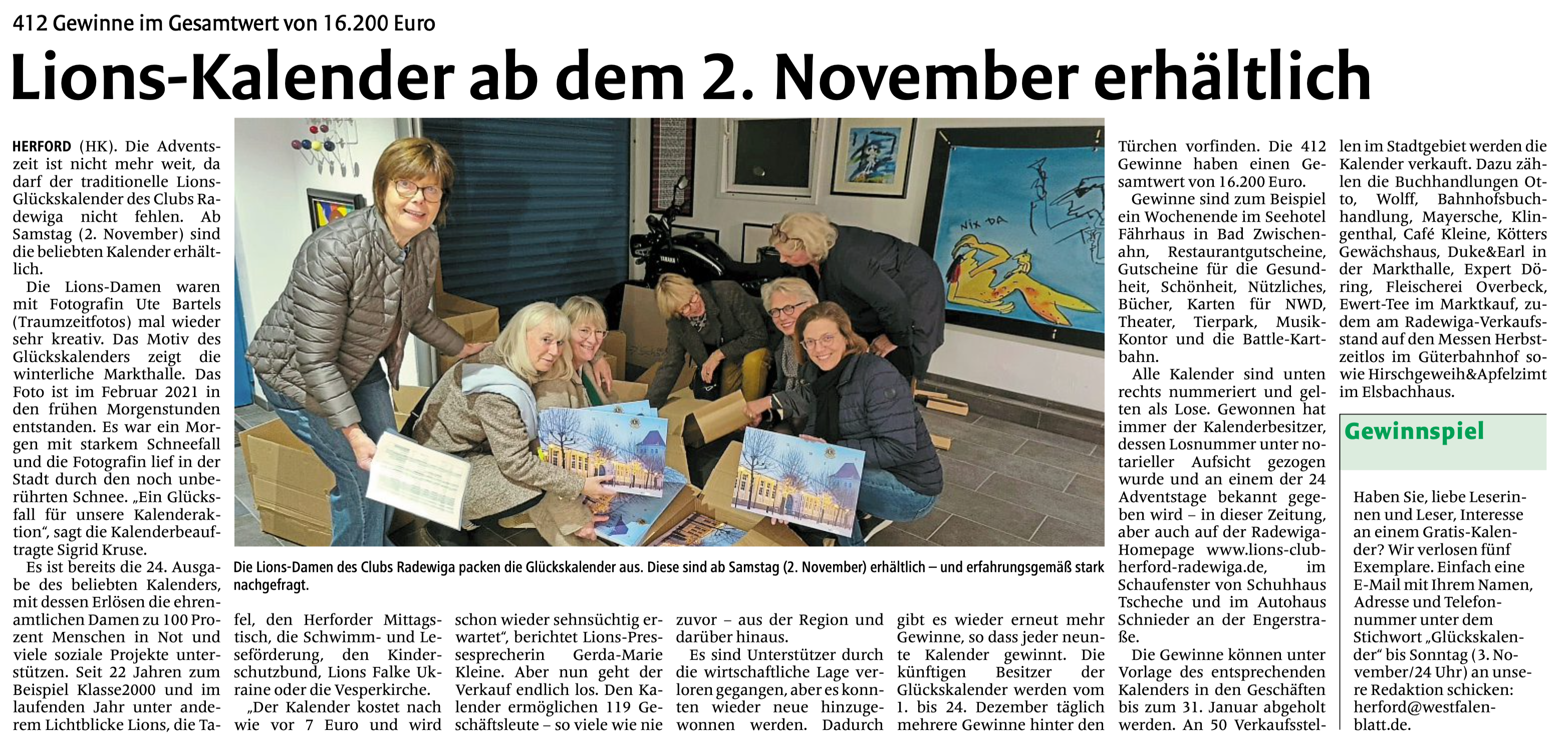 Ab sofort kann der Glückskalender 2024 des Lions Clubs Herford-Radewiga in den bekannten Vorverkaufsstellen erworben werden. Wir bedanken uns ganz herzlich bei den vielen Sponsorinnen und Sponsoren, die auch in diesem Jahr wieder attraktive und hochwertige Preise zur Verfügung stellen. Ein Kalender kostet sieben Euro. Mit dem Erlös des Kalenders werden Projekte, Vereine und Institutionen vor Ort unterstützt, wie zum Beispiel der Herforder Mittagstisch oder der Kinderschutzbund.